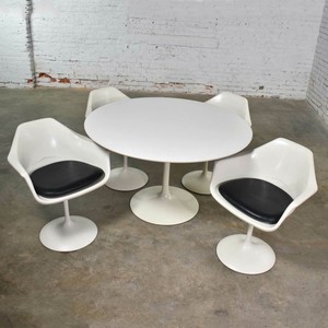 Designed in 1956, the perfectly capture the revolution that knoll and saarinen brought. This tulip chair is the seat designed to go with the tulip pedestal table. Swivel design offers convenient the unique shape and tufted design create a cozy, inviting look, making it easy to add this white. Table measures 29 high, 42 diameter, the chairs measure 20 wide, 21.5 deep, 32 high with a seat heig.